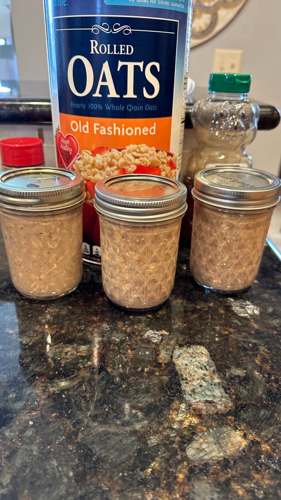 Mix all of the ingredients in a mason jar. Sir well. Screw on top. Shake well. Put jars in the fridge for a minimum of 3 hours. Ideally you’d want them to sit over night (hence the name). Open the next day, and enjoy. Have fun with the toppings; bananas, chocolate chips, melted peanut butter, chopped nuts, etc.. Makes a great lunch – it’s become my go to.
