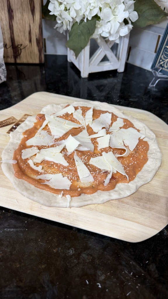 6. Spoon sauce on the dough, sprinkle with cheese, then add your toppings. Transfer the pizza from peel to the hot stone.