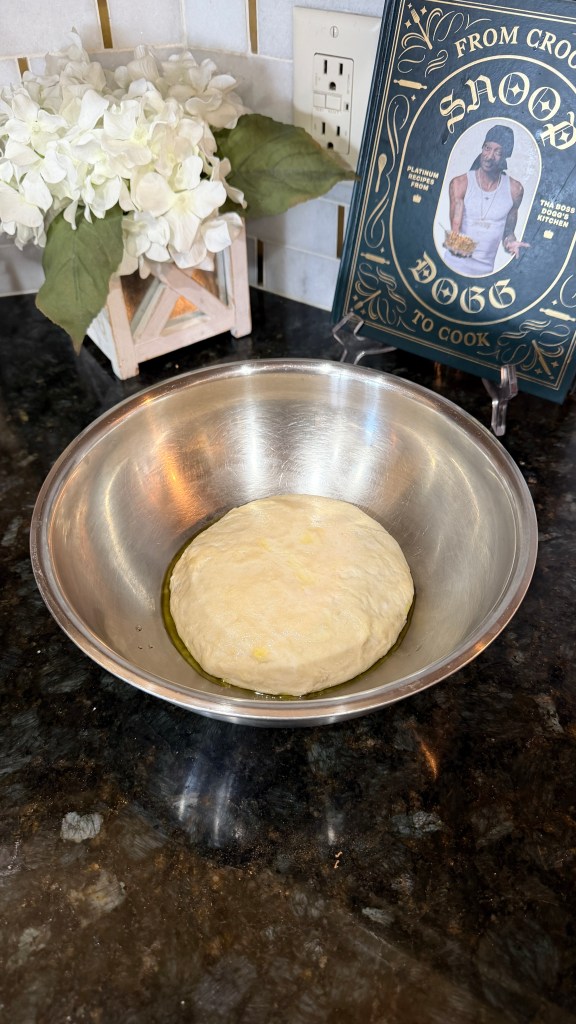 2. Divide the dough in half, shape each half into a ball, and place each into a lightly greased bowl. Cover and let rise for 45 minutes to an hour while your oven preheats.